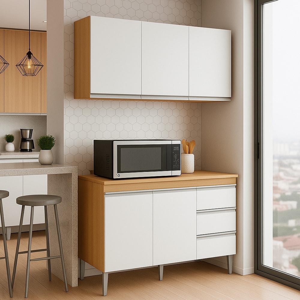 Armario Aereo E Balcao Com Tampo 120 cm Andreia Amendoa Branco REAJL Moveis