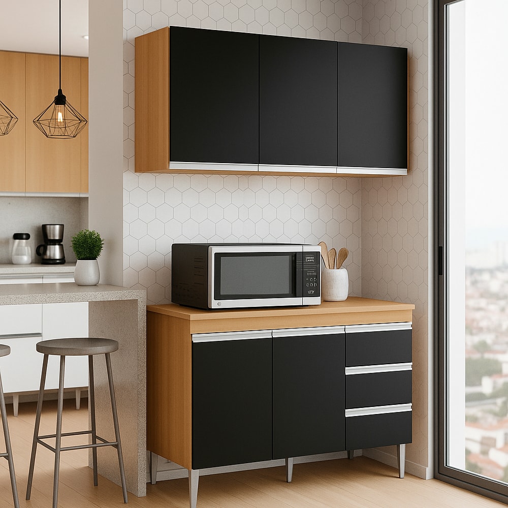 Armario Aereo E Balcao Com Tampo 120 cm Andreia Amendoa Preto REAJL Moveis