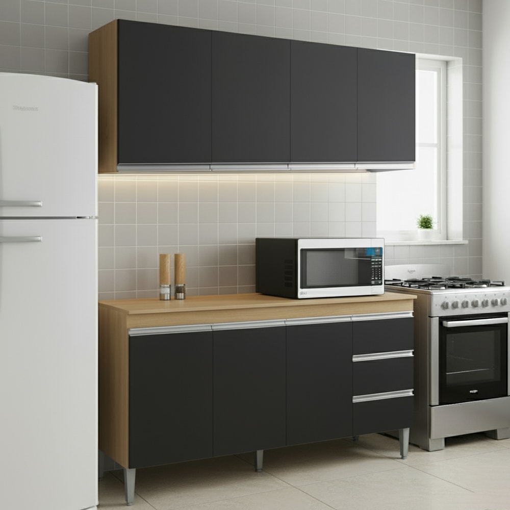 Armario Aereo E Balcao Com Tampo 160 cm Andreia Amendoa Preto REAJL Moveis