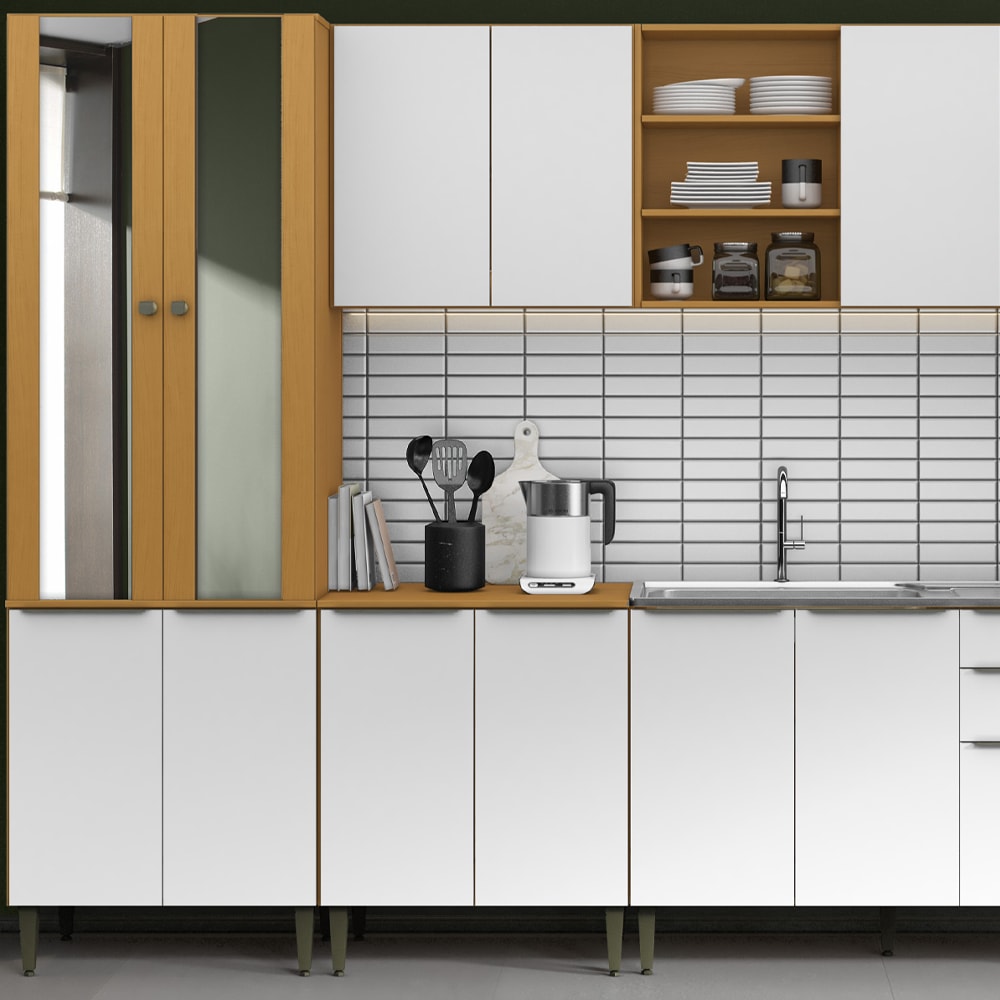 Armário Aéreo e Balcão com Tampo, design pratico e resistente para transformar sua cozinha. Estrutura em MDF (15/12 mm) e acabamento em Verniz. Possui portas com dobradiças metálicas, puxadores e pés (15 cm, regulagem de 3cm) em plástico e prateleiras internas. Estes produtos serão entregues em 2 volumes.