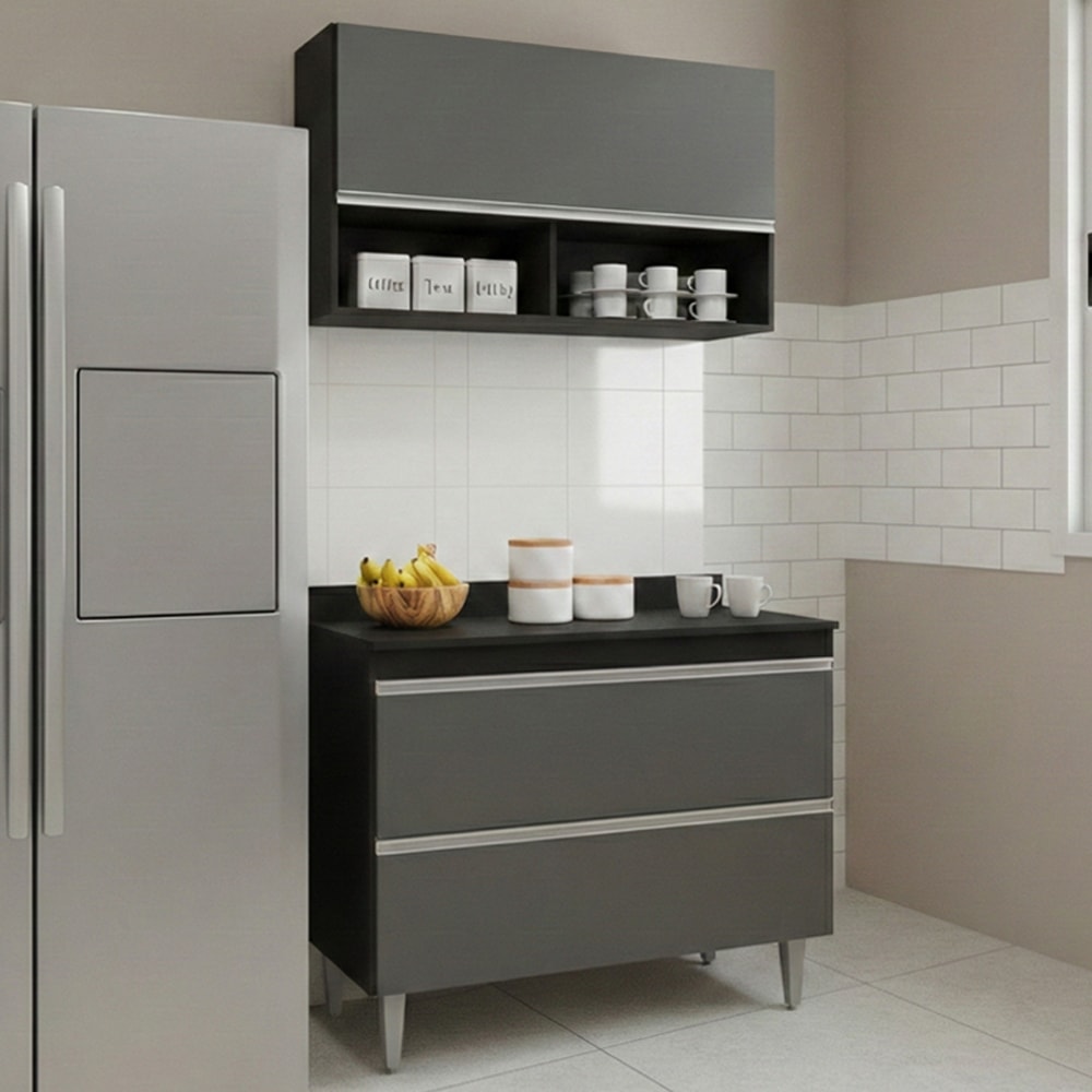 Armário Aéreo Laura e Balcão Com Tampo Esmeralda, conjunto prático para uma cozinha mais funcional! Estrutura em MDP 15 mm com acabamento BP. Composto por portas basculante (portas do balcão contém sistema fecho trava) com dobradiças metálicas, puxadores em perfil de alumínio, nichos externos para armazenar temperos ou objetos decorativos e espaço amplo nas prateleiras internas. Acompanha também pés em plástico com regulagem de altura. Produto será entregue em 03 volumes.