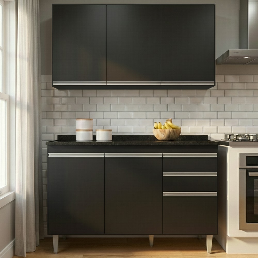 Armario Aereo E Balcao Com Tampo BP 120 cm Preto Eratto Moveis