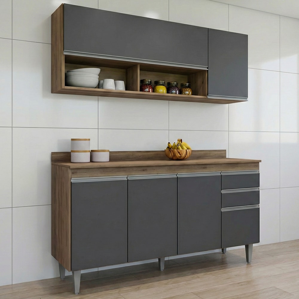 Armario Aereo E Balcao Com Tampo BP 150 cm Freijo Grafite Eratto Moveis