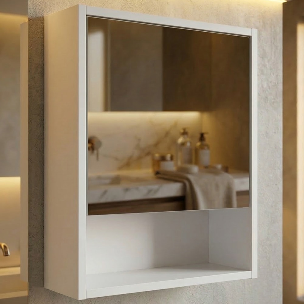 Armário Espelheira B85, funcional e elegante, a combinação perfeita entre beleza e utilidade! Composto por Estrutura MDP de 15 mm e acabamento UV fosco. Possui porta passante com espelho 3 mm, dobradiças metálicas prateleiras internas (suportando até 2,5 kg cada) e nicho externo para armazenamento, sendo a escolha perfeita para seu ambiente. NÃO ACOMPANHA OBJETOS NEM DEMAIS DECORAÇÕES. Este produto será entregue em 1 volume.