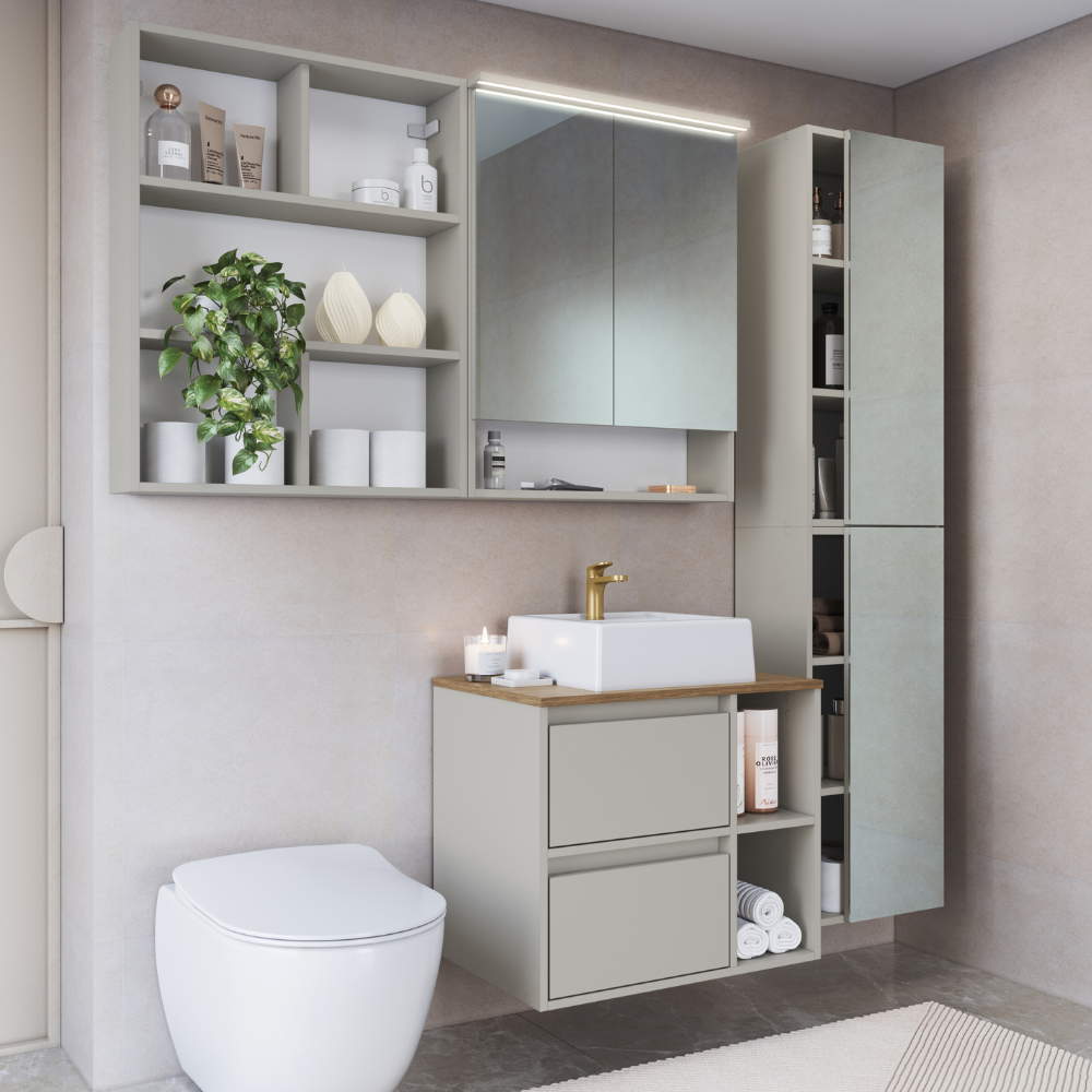 Armários E Gabinete CB.BN8005, a transformação completa para seu banheiro!. Produzido em MDP 15mm com acabamento fosco. Possui porta basculante com pistão a gás invertido, gavetão com corrediças telescópicas, nichos laterais funcionais e abertura tipo cava. Inclui cuba em mármore sintético, portas passantes com espelho 3mm e fita LED superior, além de nicho decorativo inferior e prateleira interna. Conta com espaços funcionais para organização em diferentes ambientes. Acompanha o Armário Multiuso que oferece montagem flex para instalação à esquerda ou direita. TORNEIRA NÃO INCLUSA. Este conjunto será entregue em 6 volumes.