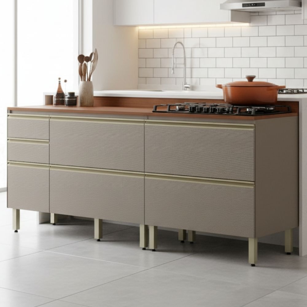 Sofisticado e funcional, o Conjunto Balcão e Armário Proença foi pensado para otimizar o espaço com elegância. Produzidos 100% em MDF (20 e 15 mm) com acabamento em pintura UV. Conta com portas basculantes com pistão a gás e dobradiças metálicas de 35 mm, gavetas laterais (uma com divisor de talheres) e gavetão inferior, equipadas com corrediças telescópicas, pés com regulagem de altura, puxadores em alumínio e tampo em MDF 20mm. Este produto será entregue em 04 volumes.