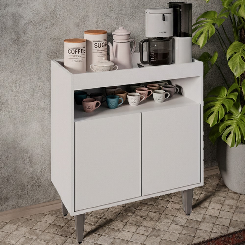 Balcão Aparador Alice, design que valoriza o ambiente no dia a dia! Estrutura em MDP 15 mm com acabamento BP. Possui portas com dobradiças metálicas e sistema de abertura passante, amplo espaço de armazenamento interno, nicho decorativo e tampo estilo bandeja, ideal para acomodar decorações ou utensílios diversos. Pés em plásticos (com regulagem) para maior estabilidade ao móvel. Produto será entregue em 01 volume.