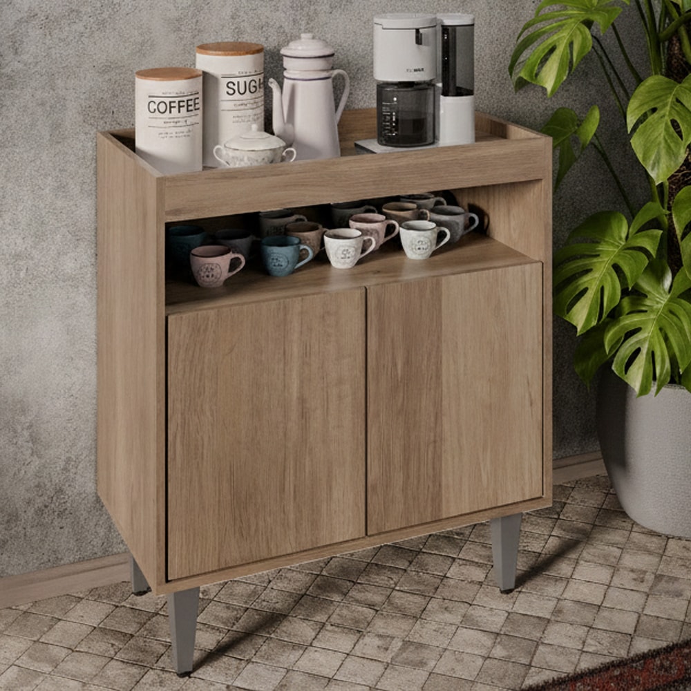 Balcão Aparador Alice, design que valoriza o ambiente no dia a dia! Estrutura em MDP 15 mm com acabamento BP. Possui portas com dobradiças metálicas e sistema de abertura passante, amplo espaço de armazenamento interno, nicho decorativo e tampo estilo bandeja, ideal para acomodar decorações ou utensílios diversos. Pés em plásticos (com regulagem) para maior estabilidade ao móvel. Produto será entregue em 01 volume.