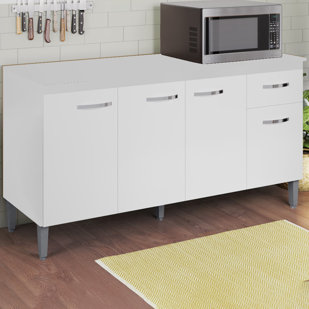 Balcão Com Tampo Gabriela, funcional e compacto para seu dia a dia. Estrutura em MDP (12/ 15 mm - fundo 3 mm) com acabamento em pintura UV. Composto por portas e gavetas com dobradiças e corrediças metálicas, ampla prateleira interna com divisão e puxadores/pés ambos em plásticos (pés com regulagem). Produto será entregue em 02 volumes.