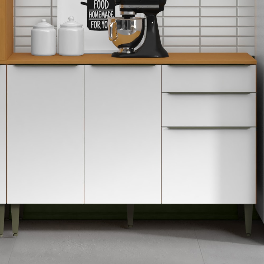Balcão para cozinha 2006806, design moderno e funcional para completar sua cozinha. Estrutura em MDF (15/12 mm) com acabamento em Verniz. Possui portas com dobradiças metálicas, gavetas com corrediças telescópicas, puxadores em plástico, prateleira interna e pés em plástico de 15 cm (regulagem de 3cm). Tampo já incluso (não acompanha pia) Este produto será entregue em 1 volume.