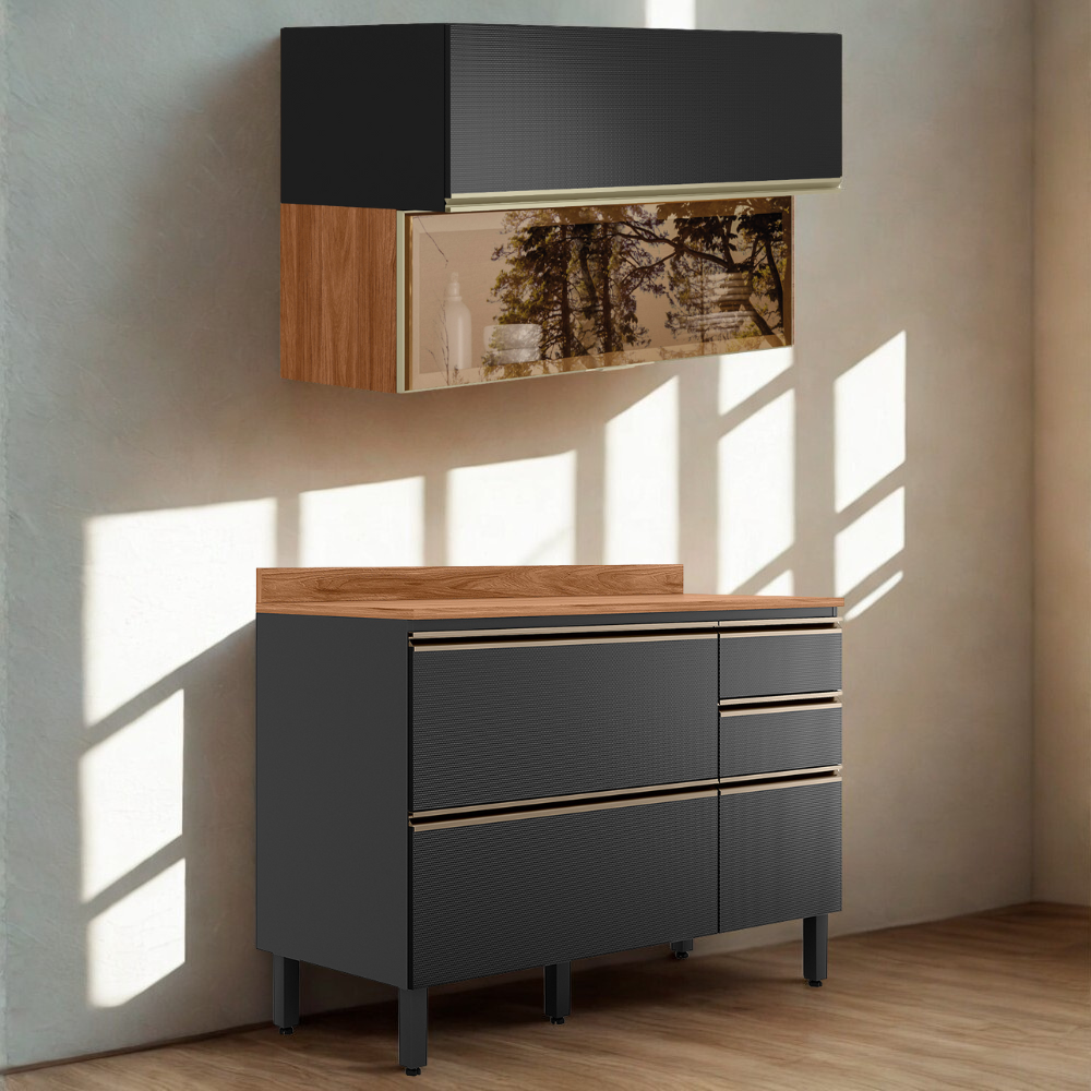 Sofisticado e funcional, o Conjunto Balcão e Armário Proença foi pensado para otimizar o espaço com elegância. Produzidos 100% em MDF (20 e 15 mm) com acabamento em pintura UV. Conta com portas basculantes com pistão a gás e dobradiças metálicas de 35 mm (sendo uma com vidro Reflecta de 3 mm), gavetas laterais (uma com divisor de talheres) e gavetão inferior, equipadas com corrediças telescópicas, pés com regulagem de altura, puxadores em alumínio e tampo em MDF 20mm. Este produto será entregue em 04 volumes.