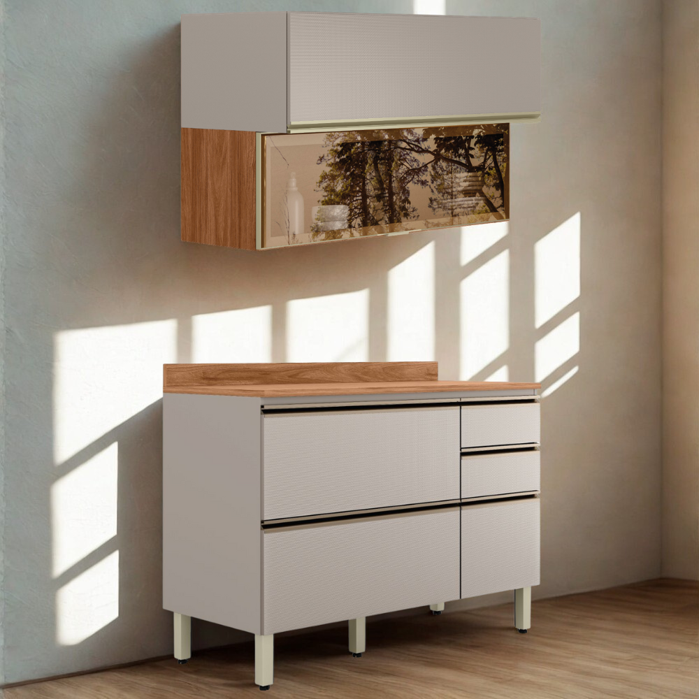 Sofisticado e funcional, o Conjunto Balcão e Armário Proença foi pensado para otimizar o espaço com elegância. Produzidos 100% em MDF (20 e 15 mm) com acabamento em pintura UV. Conta com portas basculantes com pistão a gás e dobradiças metálicas de 35 mm (sendo uma com vidro Reflecta de 3 mm), gavetas laterais (uma com divisor de talheres) e gavetão inferior, equipadas com corrediças telescópicas, pés com regulagem de altura, puxadores em alumínio e tampo em MDF 20mm. Este produto será entregue em 04 volumes.