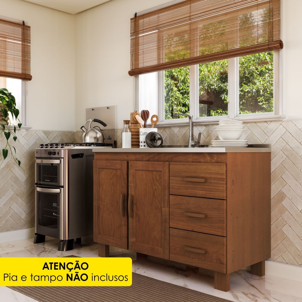 Balcão Para Pia 1291C, um clássico atemporal com aparência rústica para renovar sua cozinha! Estrutura em Madeira Maciça Taeda (presença calorosa, toque orgânico) com acabamento em pintura brilho 10%. Composto por portas com detalhes emoldurados, equipadas com dobradiças metálicas e puxadores em Madeira Maciça assim como nas gavetas, compostas também por corrediças telescópicas. Além de prateleiras internas em MDF de 12 mm e pés reforçados em Madeira Maciça. NÃO ACOMPANHA PIA NEM TAMPO. Produto será entregue em 01 volume.