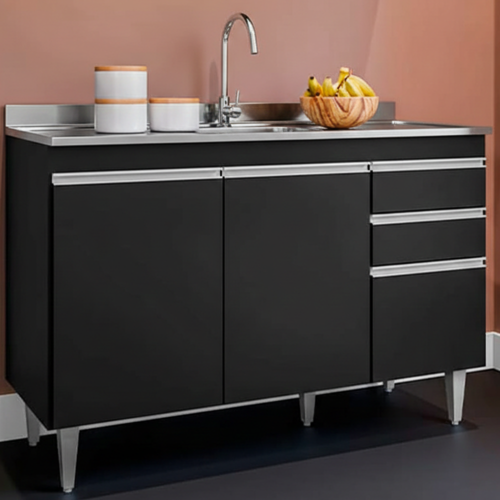 Balcão Para Pia Melissa, ideal para compor sua cozinha com funcionalidade e eficiência! Estrutura em MDP 15 mm com acabamento BP. Composto por portas e gavetas com dobradiças e corrediças metálicas, puxadores em perfil de alumínio, além de amplo espaço interno com prateleira. Acompanha também pés em plástico com regulagem de altura. TAMPO/PIA NÃO INCLUSO. Produto será entregue em 01 volume.