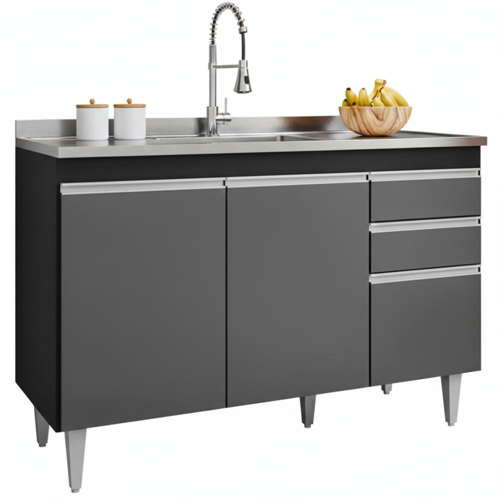 Balcão Para Pia Melissa, ideal para compor sua cozinha com funcionalidade e eficiência! Estrutura em MDP 15 mm com acabamento BP. Composto por portas e gavetas com dobradiças e corrediças metálicas, puxadores em perfil de alumínio, além de amplo espaço interno com prateleira. Acompanha também pés em plástico com regulagem de altura. TAMPO/PIA NÃO INCLUSO. Produto será entregue em 01 volume.