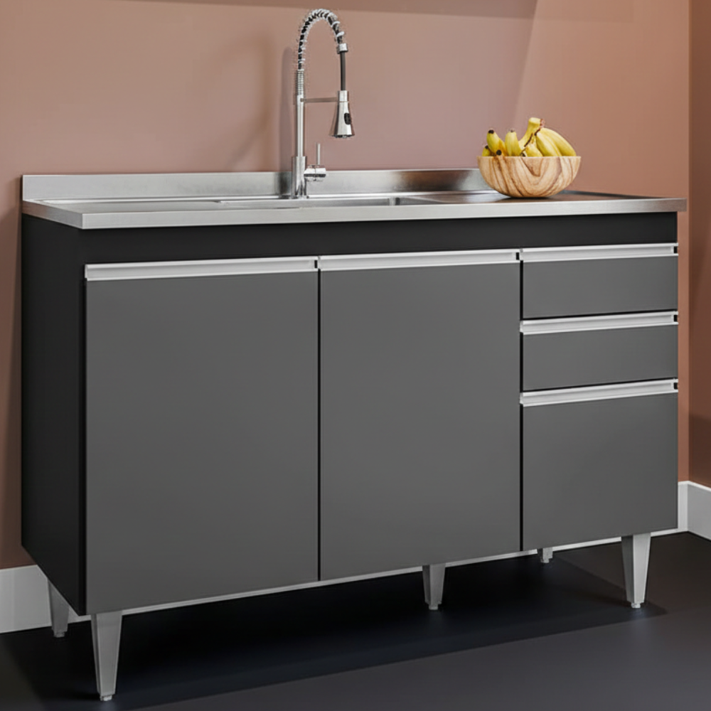 Balcao Para Pia 3 Portas 2 Gavetas Melissa 120 cm Preto Grafite Eratto Moveis