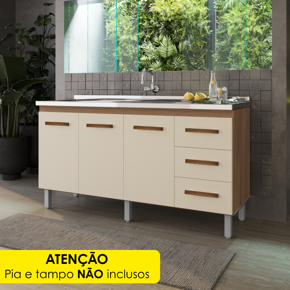 Balcão Para Pia Diana, espaçoso e funcional, o modelo ideal para otimizar seu tempo na cozinha! Produzido em MDP (12/15 mm), com acabamento em pintura UV. Possui 3 portas equipadas com dobradiças metálicas e 3 gavetas com corrediça telescópica, prateleira interna, pés reguláveis e puxadores em plástico. ATENÇÃO: NÃO ACOMPANHA PIA/TAMPO/TORNEIRA. Este produto será entregue em 01 volume.