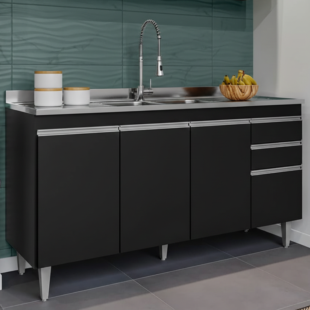 Balcao Para Pia 4 Portas 2 Gavetas BP 150 cm Ayla Preto Eratto Moveis