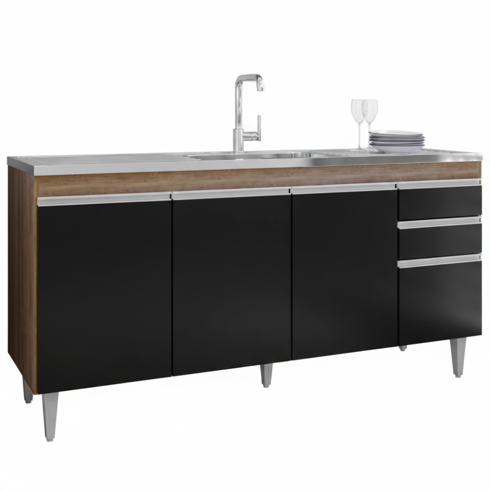 Balcao Para Pia 4 Portas 2 Gavetas BP 160 cm Lorena Freijo Preto Eratto Moveis