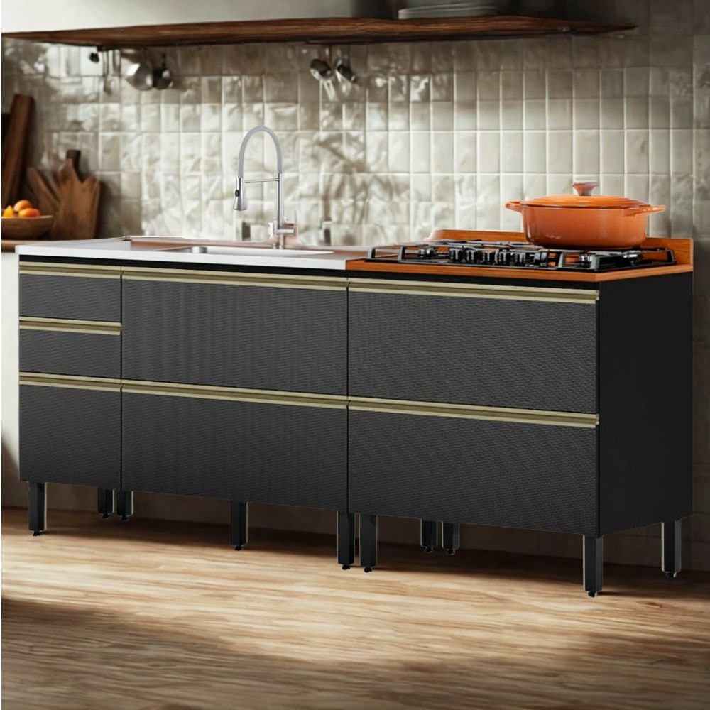 Sofisticado e funcional, o Conjunto de Balcões Proença foi pensado para otimizar o espaço com elegância. Produzidos 100% em MDF (20 e 15 mm) com acabamento em pintura UV. Conta com portas basculantes com pistão a gás e dobradiças metálicas de 35 mm, gavetas laterais (uma com divisor de talheres) e gavetão inferior, equipadas com corrediças telescópicas, pés com regulagem de altura, puxadores em alumínio e balcão de 80cm com tampo em MDF 20mm. NÃO ACOMPANHA COOKTOP/ NÃO ACOMPANHA RECORTE NO TAMPO PARA ENCAIXE/NÃO ACOMPANHA PIA. Este produto será entregue em 02 volumes.