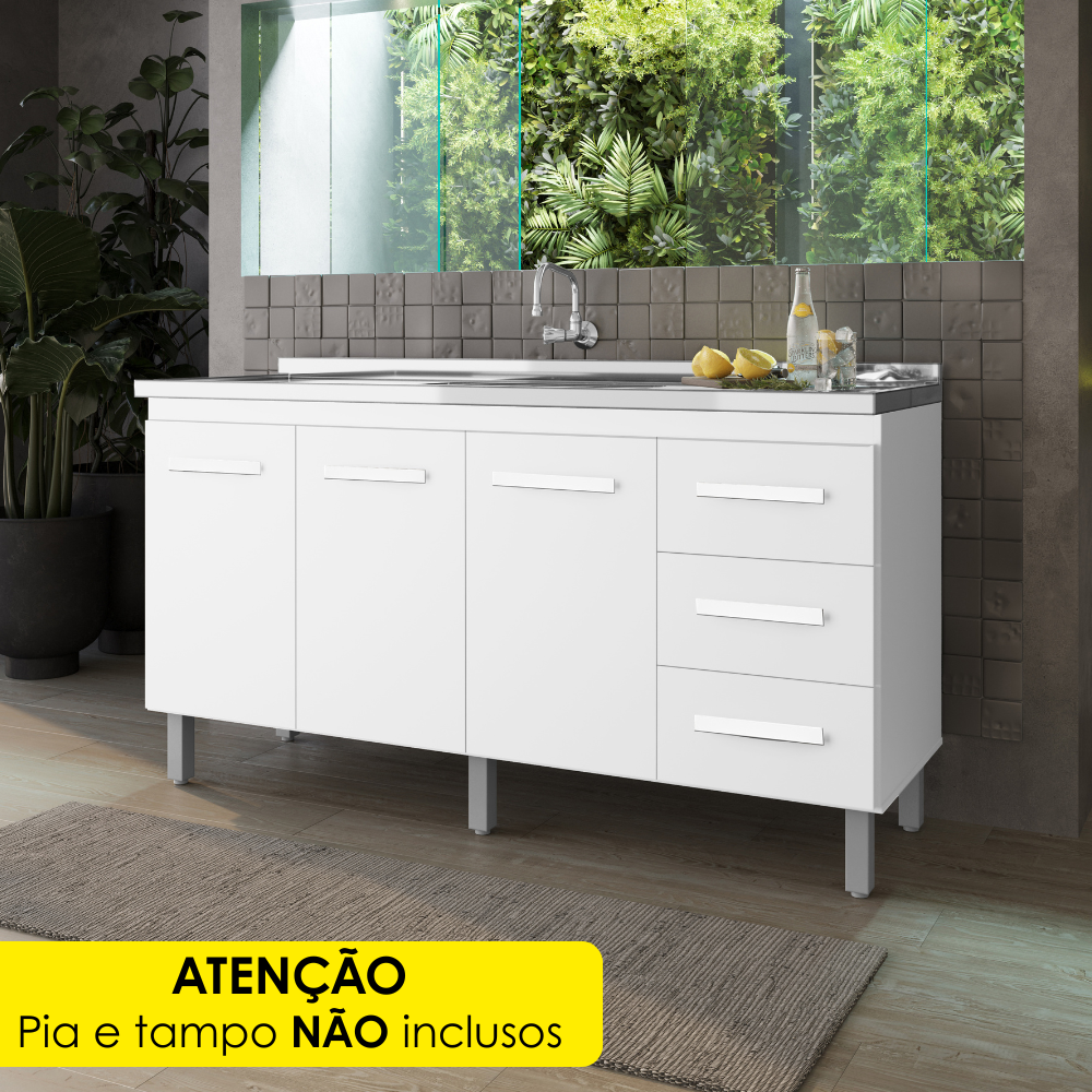 Balcão Para Pia Diana, espaçoso e funcional, o modelo ideal para otimizar seu tempo na cozinha! Produzido em MDP (12/15 mm), com acabamento em pintura UV. Possui 3 portas equipadas com dobradiças metálicas e 3 gavetas com corrediça telescópica, prateleira interna, pés reguláveis e puxadores em plástico. ATENÇÃO: NÃO ACOMPANHA PIA/TAMPO/TORNEIRA. Este produto será entregue em 01 volume.