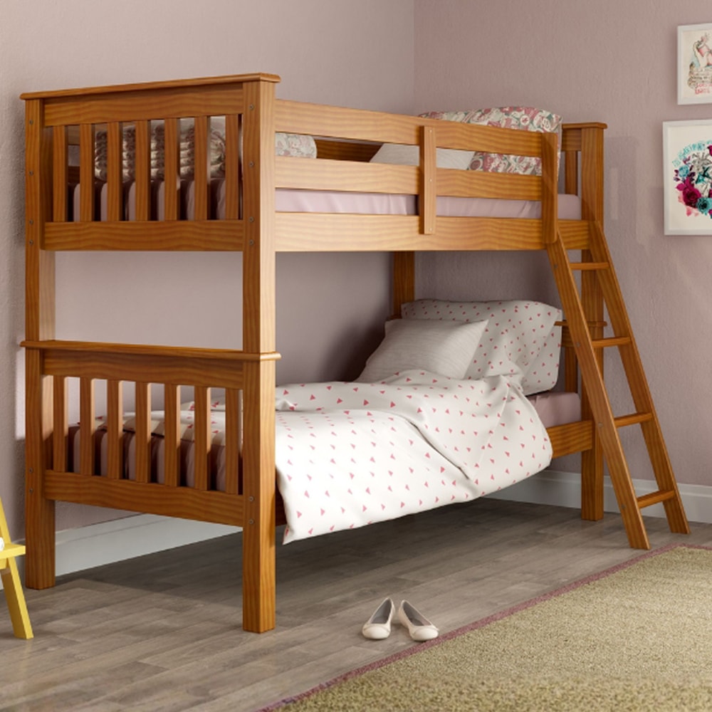 Cama Beliche 721LA imponente e clássica, ideal para compor quartos com elegância! Com estrutura 100% em Madeira Maciça de Pinus (sendo os lastros em Madeira de Eucalipto 2,3 cm) e acabamento UV acetinado. Composta por camas reforçadas, escada com gancho de fixação mantendo-a firme na beliche mas sem ser fixa (podendo ser retirada quando quiser) e pés com espessura de 6,3 cm. O espaçamento entre as camas é de 67 cm, suportando até 80kg na superior e 100kg na inferior, ambas ideais e indicadas para colchões de 188x88 cm. NÃO ACOMPANHA COLCHÃO NEM DEMAIS DECORAÇÕES. Produto será entregue em 3 volumes.