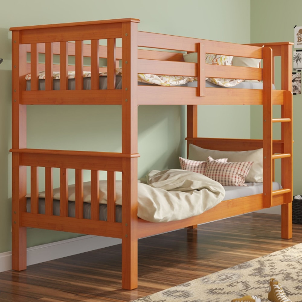 Cama Beliche 730LA alinhando conforto e funcionalidade em um móvel clássico! Com estrutura 100% em Madeira Maciça de Pinus (sendo os lastros em Madeira de Eucalipto 2,3 cm) e acabamento UV Fosco. Composta por camas reforçadas, escada fixa (não removível pós instalação) e pés com espessura de 6,3 cm. O espaçamento entre as camas é de 67 cm, suportando até 80kg na superior e 100kg na inferior, ambas ideais e indicadas para colchões de 188x88 cm. NÃO ACOMPANHA COLCHÃO NEM DEMAIS DECORAÇÕES. Produto será entregue em 3 volumes.