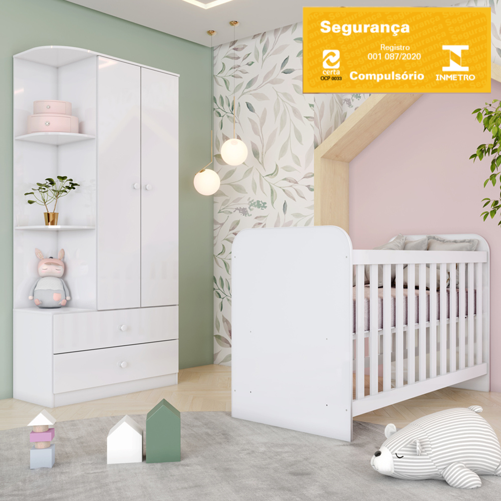 Transforme o quartinho onde os sonhos dos pequeninos começam a crescer, com o Berço e Guarda Roupa Labirinto! Berço aprovado e certificado conforme regulamento do INMETRO (Registro Nº 001 087/2020). Produzidos em MDP e MDF (06/12/15/25 mm) com pintura UV texturizada. O berço é composto por cabeceiras em MDP (12 mm)  com detalhe em moldura (MDP 15mm), grades fixas em MDF (06 mm), estrado também em MDF (25 mm) e suporte de mosquiteiro, acompanha 2 opções de regulagem de altura no estrado (posição mais baixa 21,6 cm e posição alta 51 cm do estrado ao chão), e é indicado para colchões de tamanho 130 cm x 60 cm. O Guarda Roupa conta com portas com dobradiças metálicas, gavetas com corrediças metálicas para abertura suave e puxadores em ABS. Conta também com prateleira interna, cabideiro em alumínio e prateleiras decorativas laterais com bordas arredondadas. NÃO ACOMPANHA COLCHÃO E DEMAIS DECORAÇÕES. Produto será entregue em 02 volumes.
