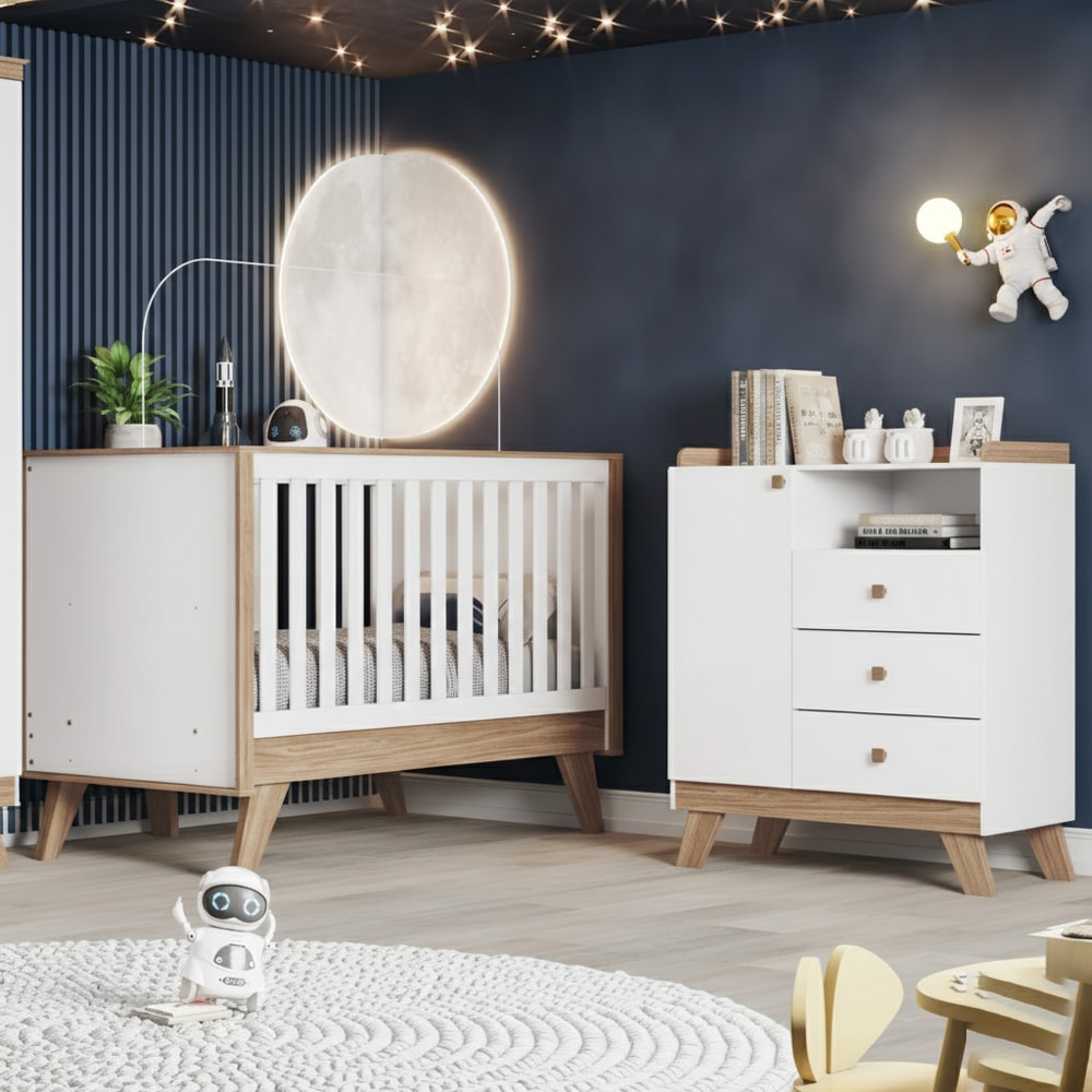 Prepare-se para se apaixonar por cada pedacinho desse quartinho encantador o Berço Mini Cama e Cômoda Confete foram pensado para trazer mais conforto e segurança! Berço aprovado e certificado conforme regulamento do INMETRO (Registro Nº 002 114/2023). Produzidos em MDP e MDF (06/12/15/25 mm) com pintura UV texturizada. O berço é composto por cabeceiras em MDP (12 mm) com detalhe em moldura (MDP 15mm), grades fixas em MDF (06 mm), estrado também em MDF (25 mm) e suporte de mosquiteiro. Com design 3 em 1 que acompanha o crescimento do bebê, transformando-se em berço-cama e mini-cama com praticidade e segurança, acompanha 2 opções de regulagem de altura no estrado (posição mais baixa 38,1 cm e posição alta 66,9 cm do estrado ao chão), e é indicado para colchões de tamanho 130 cm x 70 cm. A Cômoda conta com porta com dobradiças metálicas e gavetas com corrediças telescópicas para abertura suave, nicho superior, puxadores em ABS, pés em MDP e prateleira interna. NÃO ACOMPANHA COLCHÃO E DEMAIS DECORAÇÕES. Produto será entregue em 02 volumes.