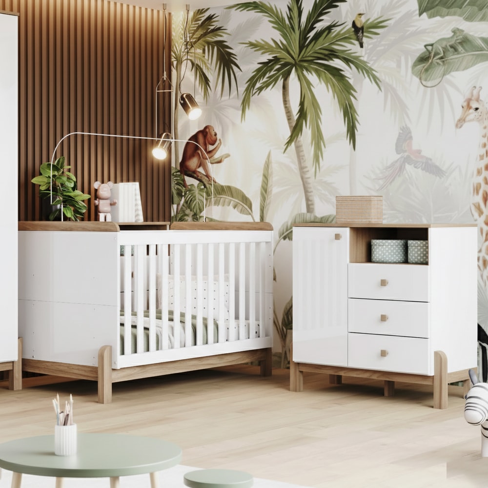 Desenvolvido para acompanhar o bebê desde os primeiros dias o Berço Mini Cama e Cômoda Ternura foram pensado para trazer mais conforto e segurança! Berço aprovado e certificado conforme regulamento do INMETRO (Registro Nº 002 990/2024). Produzidos em MDP e MDF (06/12/15/25 mm) com pintura UV texturizada. O berço é composto por cabeceiras em MDP (15 mm) com bordas arredondadas, grades fixas em MDF (06 mm), estrado também em MDF (25 mm) e suporte de mosquiteiro. Com design 2 em 1 que acompanha o crescimento do bebê, transformando-se em mini-cama com praticidade e segurança, acompanha 2 opções de regulagem de altura no estrado (posição mais baixa 20 cm e posição alta 45,3 cm do estrado ao chão), e é indicado para colchões de tamanho 130 cm x 70 cm. A Cômoda conta com porta com dobradiças metálicas e gavetas com corrediças telescópicas para abertura suave, nicho superior, puxadores em ABS, pés em MDF e prateleira interna. NÃO ACOMPANHA COLCHÃO E DEMAIS DECORAÇÕES. Produto será entregue em 02 volumes.