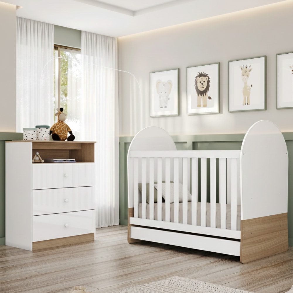 Berço Mini Cama e Cômoda Magia, o toque que faltava para um quarto infantil mais organizado e acolhedor! Berço aprovado e certificado conforme regulamento do INMETRO (Registro Nº 016 817/2024). Produzidos em MDP e MDF (06/12/15/25 mm) com pintura UV texturizada. O berço é composto por cabeceiras em MDP (12 mm) com bordas arredondadas em PVC, grades fixas em MDF (25 mm) e acompanha suporte de mosquiteiro. Com design 3 em 1 que acompanha o crescimento do bebê, transformando-se em berço-cama e mini-cama com praticidade e segurança e estrado também em MDF (6 mm), acompanha 2 opções de regulagem de altura no estrado (posição mais baixa 21 cm e posição alta 49,4 cm do estrado ao chão), e é indicado para colchões de tamanho 130 cm x 60 cm. A Cômoda conta com gavetas com corrediças telescópicas para abertura suave, nicho superior, puxadores em ABS e tampo chapéu com design soft. NÃO ACOMPANHA COLCHÃO E DEMAIS DECORAÇÕES. Produto será entregue em 02 volumes.