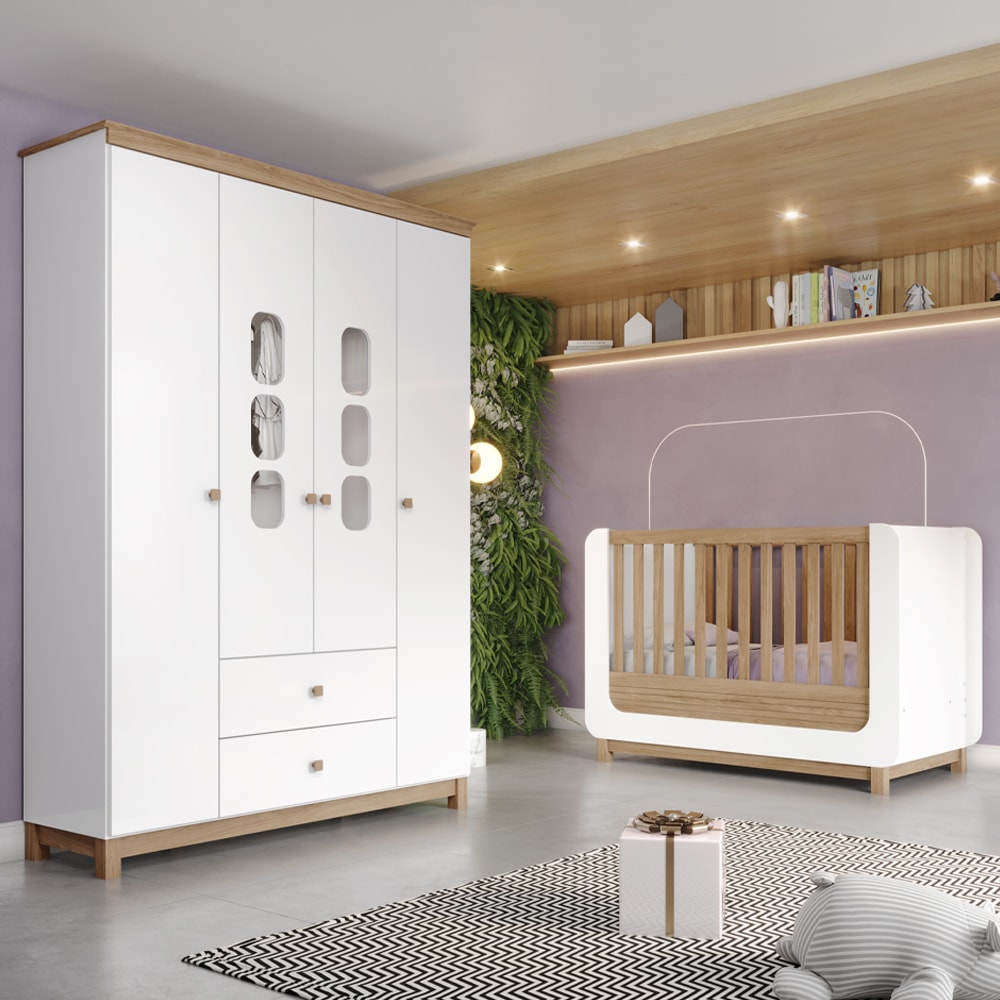 Desenvolvido para trazer praticidade ao quarto infantil, o conjunto Berço e Guarda-Roupa Aconchego entrega design funcional e segurança em cada detalhe! Berço aprovado e certificado conforme regulamento do INMETRO (Registro Nº 002 747/2024). Produzidos em MDP e MDF (06/12/15/25 mm) com pintura UV texturizada. O berço é composto por cabeceiras em MDP (15 mm) com detalhe em moldura (MDP 15mm), grades fixas em MDF (06 mm), estrado também em MDF (25 mm) e suporte de mosquiteiro. Com design 2 em 1 que acompanha o crescimento do bebê, transformando-se em mini-cama, acompanha 2 opções de regulagem de altura no estrado (posição mais baixa 30 cm e posição alta 64,4 cm do estrado ao chão), e é indicado para colchões de tamanho 130 cm x 70 cm. O Guarda Roupa conta com portas (com visor de vidro) com dobradiças metálicas, gavetas com corrediças telescópicas para abertura suave e puxadores em ABS. Conta também com prateleira interna, cabideiro em alumínio. NÃO ACOMPANHA COLCHÃO E DEMAIS DECORAÇÕES. Produto será entregue em 03 volumes.