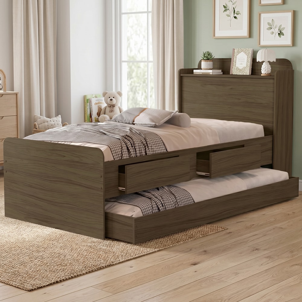 Bicama Solteiro 2 Gavetas 220X98 cm Com Bau E Cama Auxiliar MDF Castanho Decmade