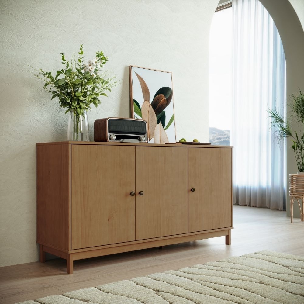 Buffet Essência, presença natural e rústica, com amplo espaço que complementa o seu ambiente. Sua estrutura é composta 100% em Madeira Maciça Taeda (presença calorosa, toque orgânico) com acabamento em pintura brilho 5%. Composto por portas equipadas de dobradiças metálicas com amortecimento e puxadores metálicos (cor ouro envelhecido). Além de tampo amplo e prateleiras internas com 16 mm de espessura e pés retos reforçados, também em Madeira Maciça. Produto será entregue em 01 volume.