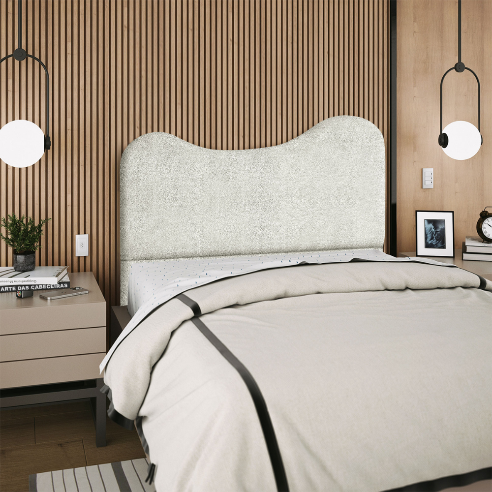 Transforme seu ambiente com a Cabeceira Selena, unindo conforto visual e estilo contemporâneo, Estrutura em Madeira Maciça de Eucalipto (reflorestada), estofamento em espuma D-18 e revestimento em tecido Bouclé (resistente, macio e confortável). Possui sapatas plásticas que evitam o contato direto com o piso e ajudam a prevenir riscos. Incluso Frame (metal resistente com reforço lateral e acabamento em pintura epóxi) para fixação em camas Box, pode haver variação no design do frame dependendo do lote de peças. A função do acessório e usabilidade permanece a mesma. Demais decorações não inclusas. Produto entregue em 1 volume.