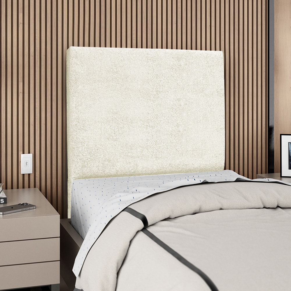 Cabeceira Solteiro Luna, moderna e aconchegante trazendo elegância para seu quarto! Estrutura em Madeira de Eucalipto (reflorestada), estofada em espuma (densidade D-18) e revestida em tecido Bouclé (macio e texturizado). Incluso Frame (metal resistente com reforço lateral e acabamento em pintura epóxi) para fixação em camas Box e sapatas plásticas. Este produto será entregue em 1 volume.