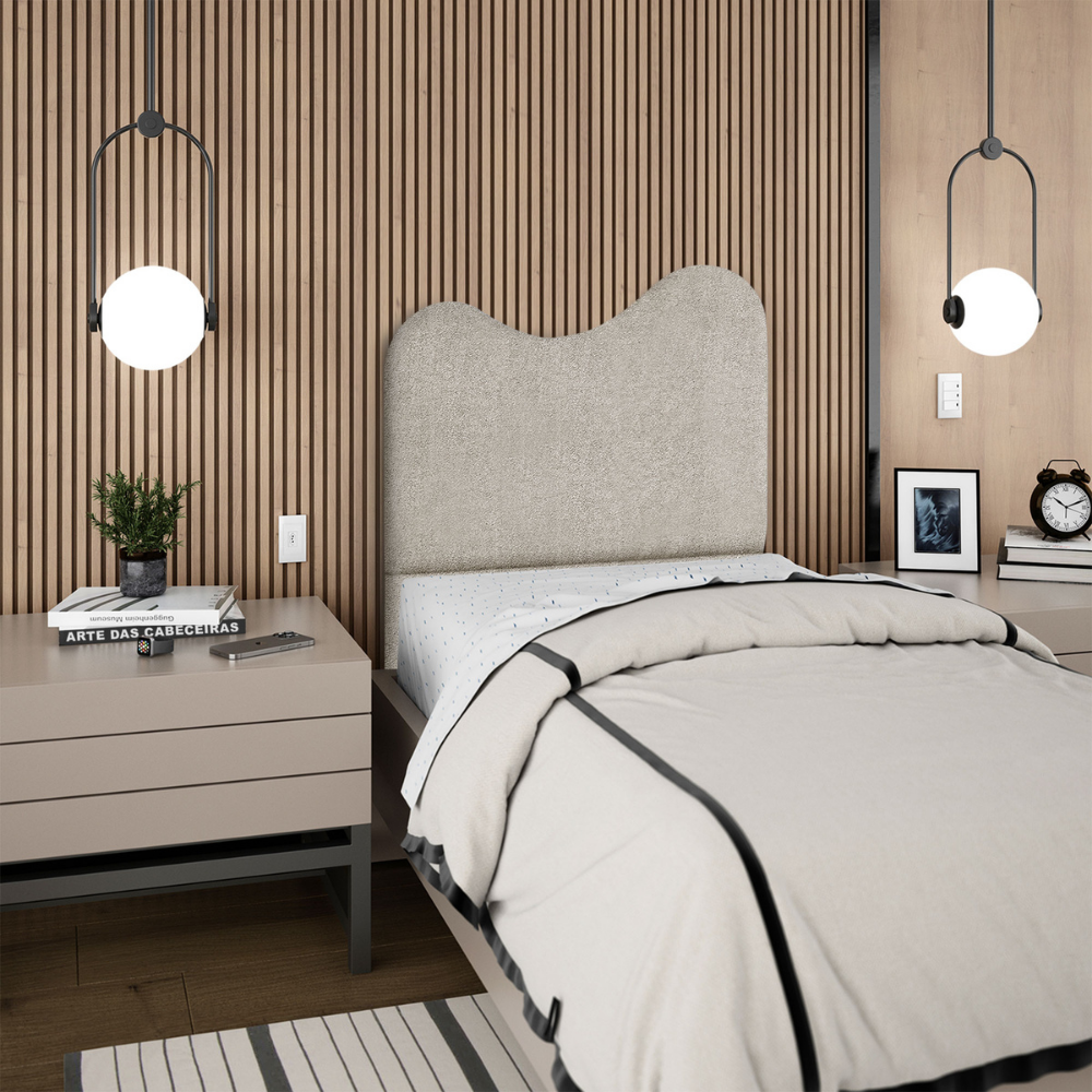 Com design orgânico e bordas curvas, a Cabeceira Solteiro Selena chega para sofisticar seu lar! Estrutura em Madeira Maciça de Eucalipto (reflorestada), estofamento em espuma D-18 e revestimento em tecido Bouclé (encorpado, macio e confortável). Possui sapatas plásticas que evitam o contato direto com o piso e ajudam a prevenir riscos. Incluso Frame (metal resistente com reforço lateral e acabamento em pintura epóxi) para fixação em camas Box, pode haver variação no design do frame dependendo do lote de peças. A função do acessório e usabilidade permanece a mesma. Demais decorações não inclusas. Produto entregue em 1 volume.