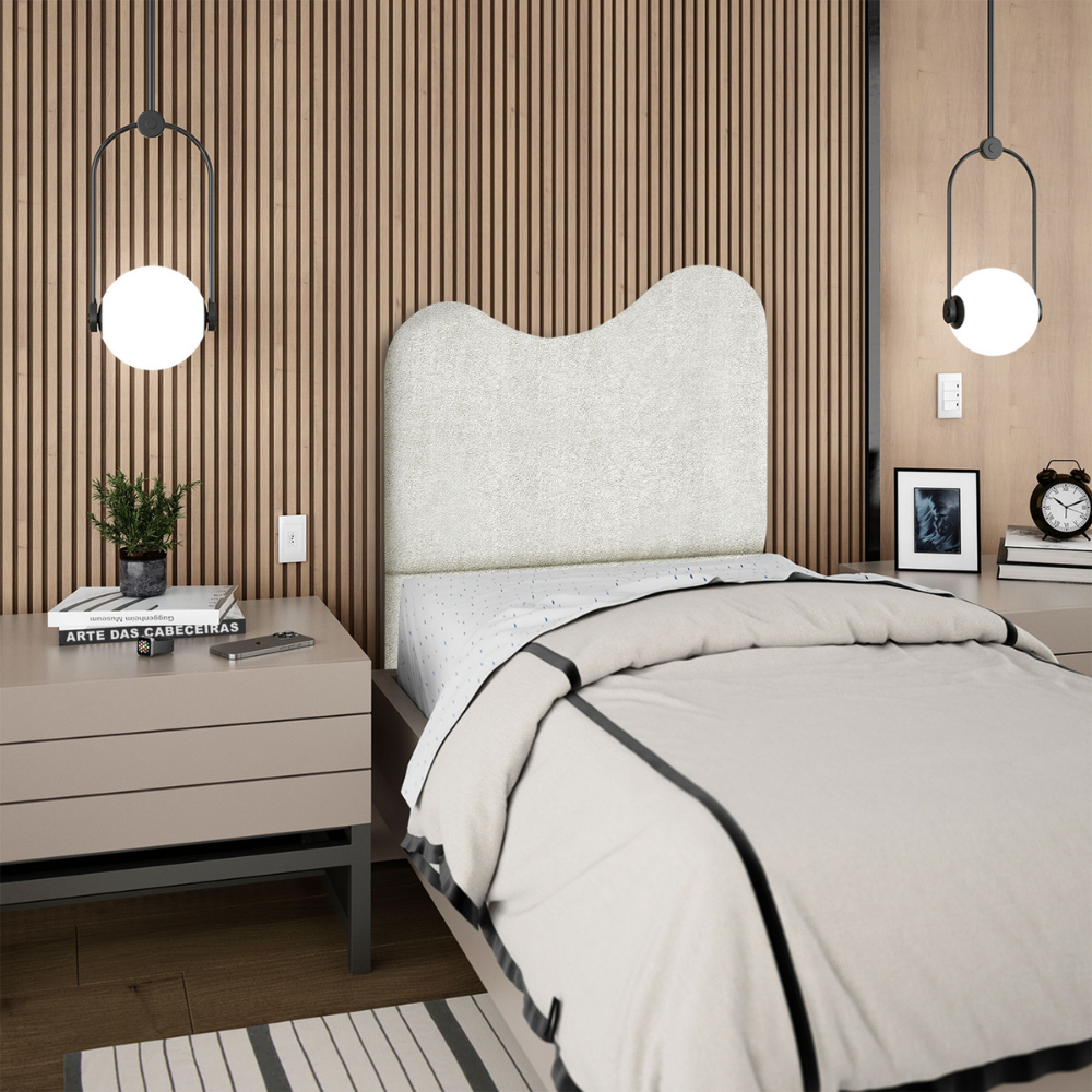Com design orgânico e bordas curvas, a Cabeceira Solteiro Selena chega para sofisticar seu lar! Estrutura em Madeira Maciça de Eucalipto (reflorestada), estofamento em espuma D-18 e revestimento em tecido Bouclé (encorpado, macio e confortável). Possui sapatas plásticas que evitam o contato direto com o piso e ajudam a prevenir riscos. Incluso Frame (metal resistente com reforço lateral e acabamento em pintura epóxi) para fixação em camas Box, pode haver variação no design do frame dependendo do lote de peças. A função do acessório e usabilidade permanece a mesma. Demais decorações não inclusas. Produto entregue em 1 volume.