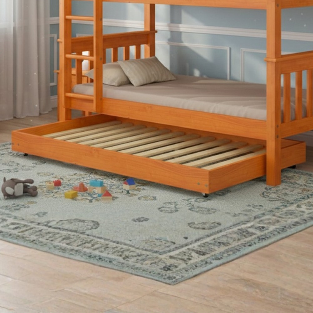Cama Auxiliar Solteiro 715LA com um design moderno e funcional perfeita para complementar seu ambiente de quarto! Com estrutura 100% em Madeira Maciça de Pinus (sendo os lastros em Madeira de Eucalipto) e acabamento UV Acetinado. Composta por Laterais reforçadas e pés em rodizio, suportando até 100kg, ideal e indicada para colchões de 188x88 cm. NÃO ACOMPANHA COLCHÃO NEM DEMAIS DECORAÇÕES. Produto será entregue em 1 volume.