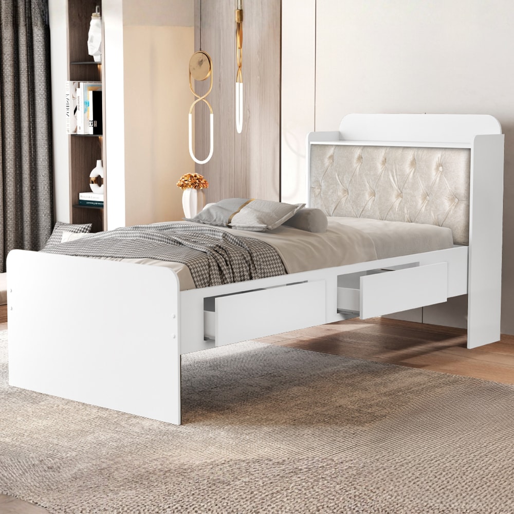 Cama Solteiro Bau 2 Gavetas MDF Tamires Capitone Branco Bege Decmade