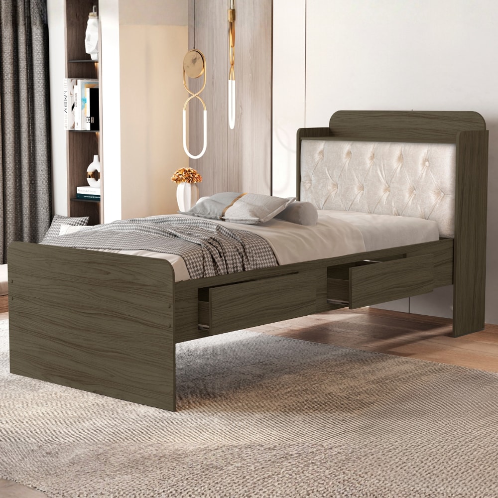 Cama Solteiro Bau 2 Gavetas MDF Tamires Capitone Castanho Bege Decmade