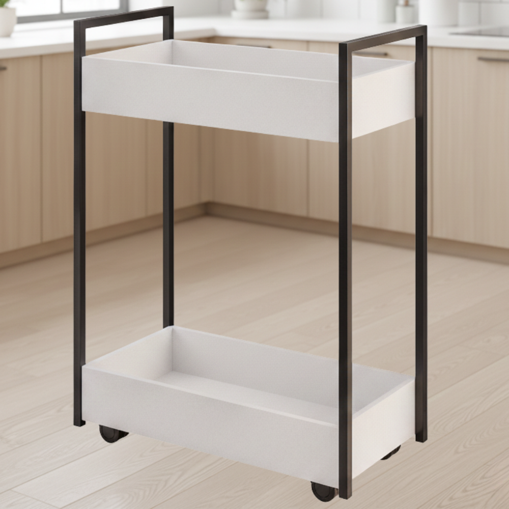 Carrinho Organizador Multiuso Lara, ideal para auxiliar na cozinha, lavanderia ou em qualquer ambiente! Produzido com estrutura em aço carbono, MDP 15 mm e acabamento BP. Conta com 2 cestos ideais para armazenamento de frutas, legumes e utensílios do dia a dia. Além de rodízios em PVC (sem travas) permitindo fácil movimentação e praticidade na limpeza. Produto será entregue em 01 volume.