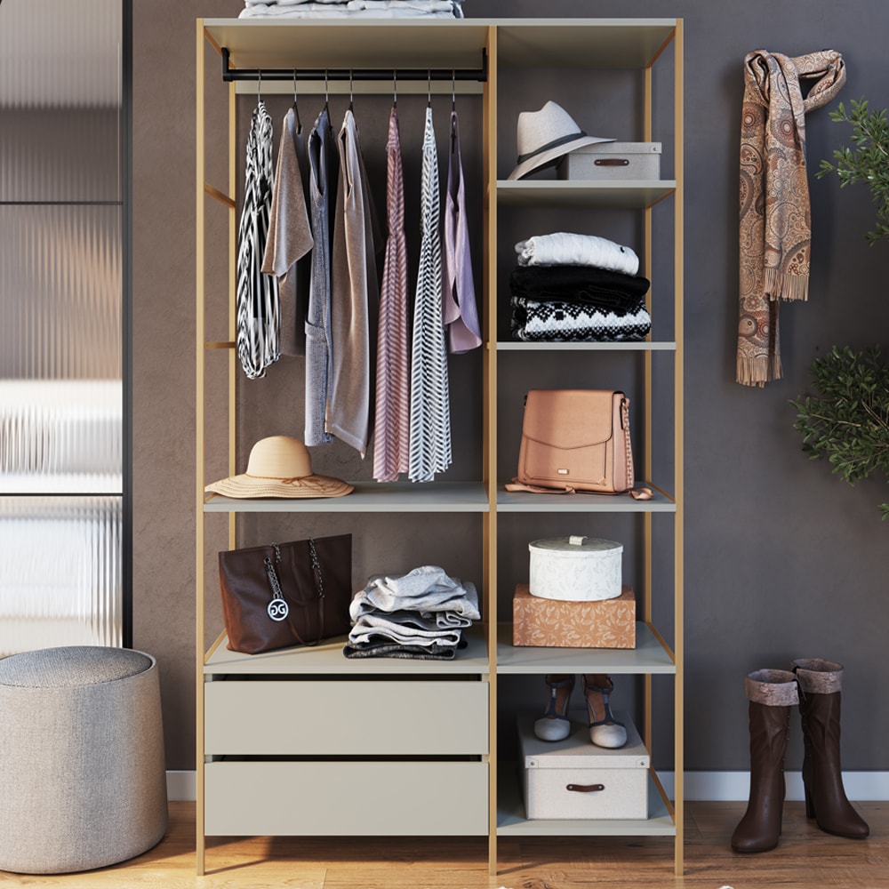 Closet Roupeiro P1025 estilo Industrial, possui design em alta e espaço de sobra para você armazenar suas peças de roupa com estilo. Estrutura em metal (pintura epóxi) e MDP de 15 mm. Conta com gavetas com frente passante e corrediças metálicas, 6 prateleiras e um cabideiro metálico. Sua base com ponteiras plásticas para evitar o atrito do móvel com o piso. É o móvel perfeito para você que busca praticidade ao guardar seus itens. Produto será entregue em 01 volume.