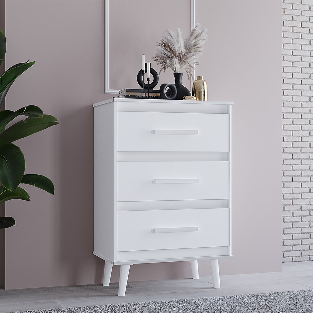 Cômoda Mila, ideal para compor quartos com modernidade e elegância. Produzida em MDP (12/15mm) com acabamento em pintura UV. Conta com 03 gavetas com corrediças telescópicas, puxadores em plástico e pés estilo retrô. Este produto será entregue em 01 volume.