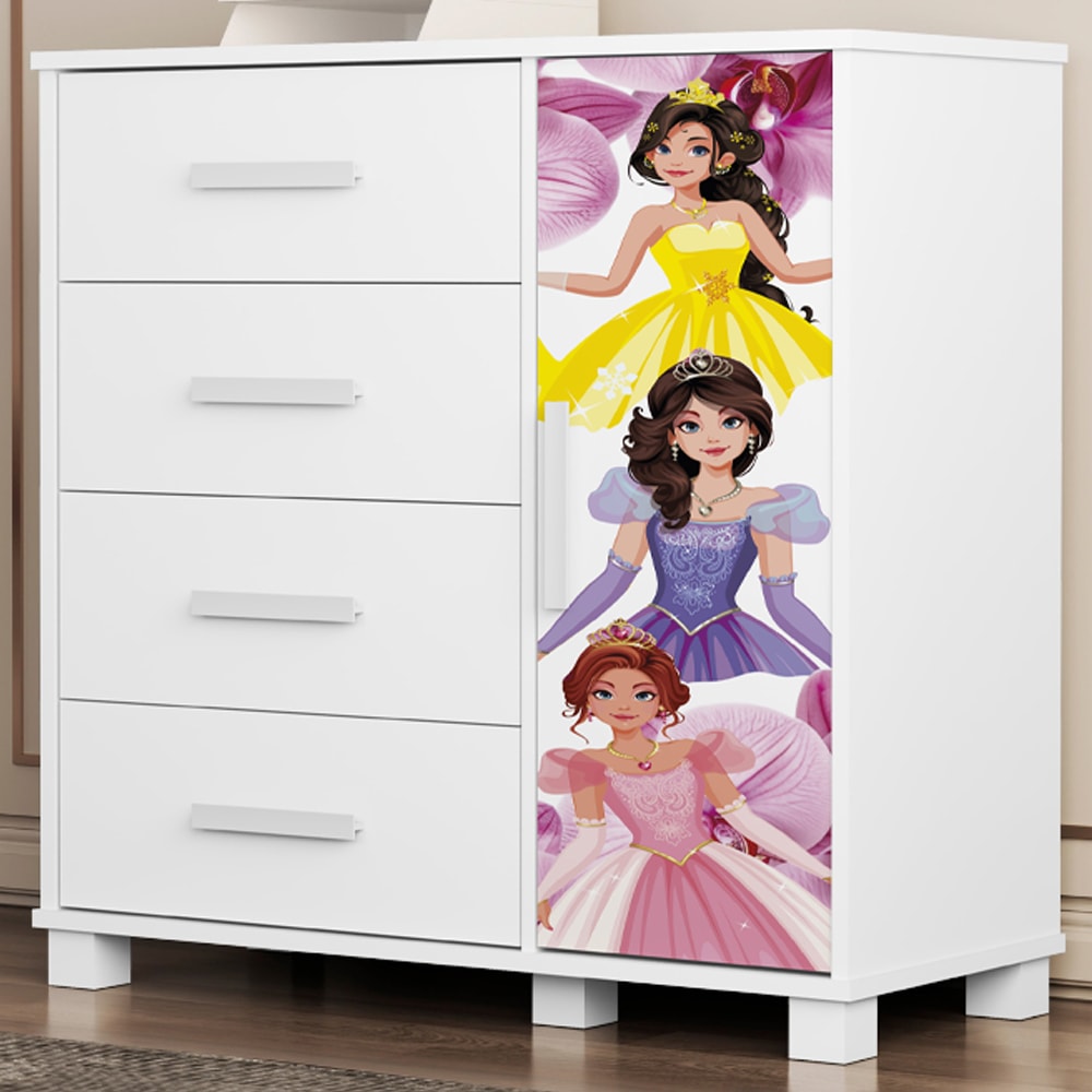 Cômoda Livia, criada para transformar o dia a dia em momentos cheios de alegria e fantasia! Estrutura 100% MDF de (03/12/15 mm) e acabamento verniz (brilho). Composta por design moderno conta com um tampo amplo e espaçoso, prateleira interna (suportando até 3 kg distribuídos), gavetas com corrediças telescópicas (suportando até 3 kg cada), porta com Adesivo Temático anti risco e dobradiças metálicas. Além de puxadores PVC. Este produto será entregue em 1 volume.