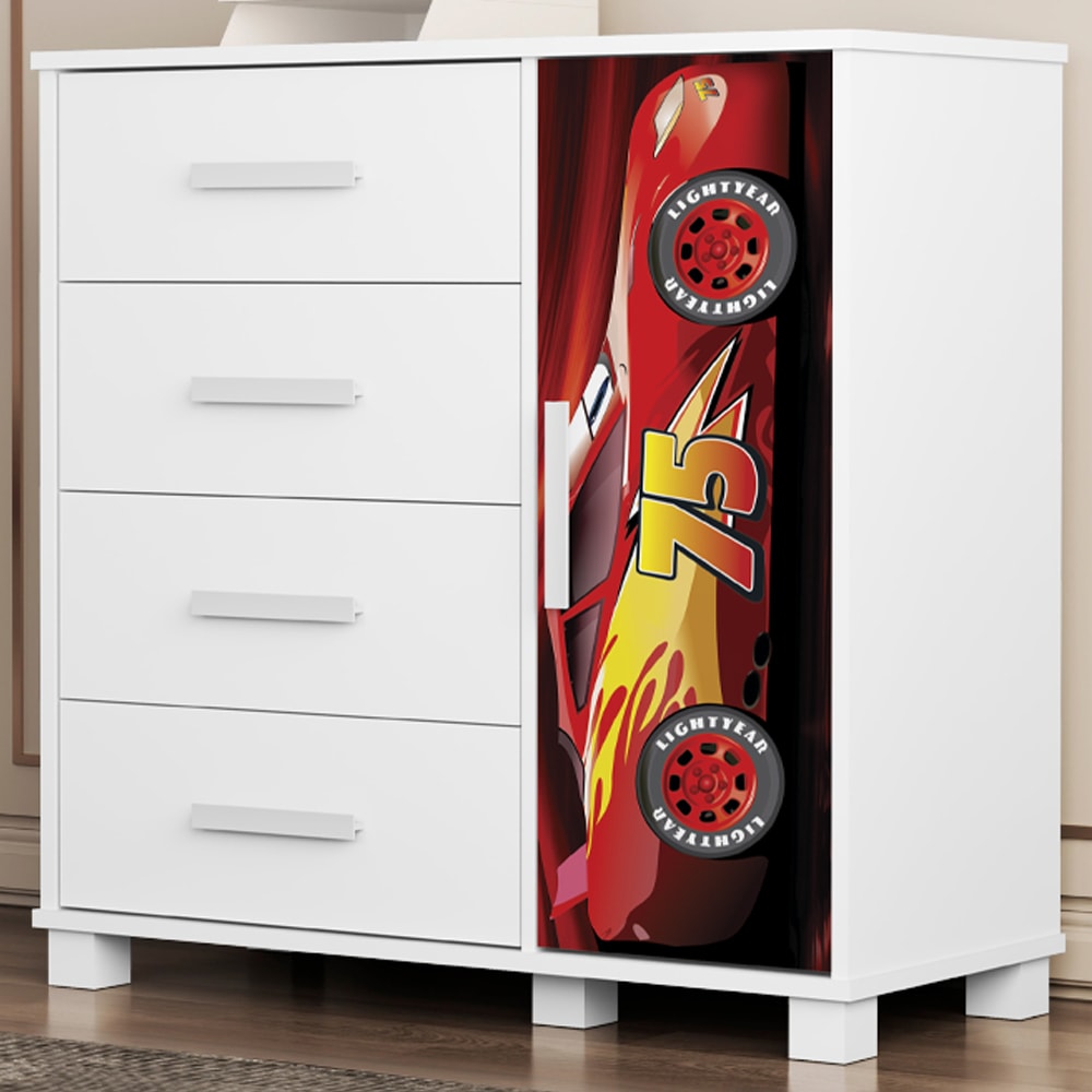 Cômoda Livia, criada para transformar o dia a dia em momentos cheios de alegria e fantasia! Estrutura 100% MDF de (03/12/15 mm) e acabamento verniz (brilho). Composta por design moderno conta com um tampo amplo e espaçoso, prateleira interna (suportando até 3 kg distribuídos), gavetas com corrediças telescópicas (suportando até 3 kg cada), porta com Adesivo Temático anti risco e dobradiças metálicas. Além de puxadores PVC. Este produto será entregue em 1 volume.
