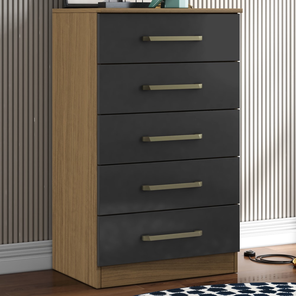 Cômoda 2014140, design resistente e versatil para implementar seu quarto. Estrutura em MDP (15/12 mm) com acabamento em Verniz. Possui gavetas com corrediças telescópicas e puxadores em plástico. Este produto será entregue em 1 volume.