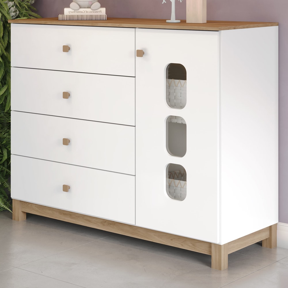 Cômoda Infantil Aconchego, o móvel ideal para o quarto das crianças! Produzida em MDP 12/15mm (fundo MDF 3mm) com pintura UV texturizada. Conta com porta (com visor de vidro) com dobradiças metálicas e gavetas com corrediças telescópicas para abertura suave, puxadores em ABS e pés em MDF, conta também com prateleira interna. Produto será entregue em 01 volume.