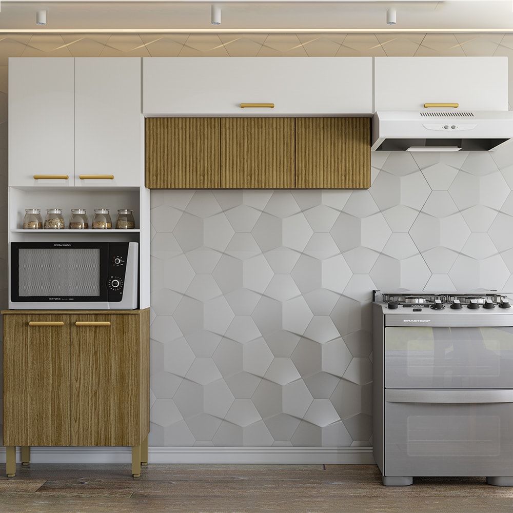 Cozinha 3 Peças, design moderno que se adapta ao seu espaço! Produzida em MDP (12/15mm) com acabamento em pintura UV. Conta com 09 portas, sendo 02 basculantes e 03 com sistema de abertura passante (sem puxadores), suporte a gás, dobradiças metálicas, nicho para microondas/forno, prateleiras internas e passa fio embutido. Os puxadores ergonômicos e pés reguláveis são em plástico resistente. Este produto será entregue em 03 volumes.