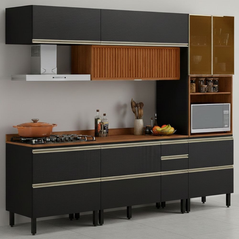 A Cozinha Modulada DP2705 foi projetada para quem busca eficiência, design moderno e funcionalidade na cozinha. O conjunto é composto por 5 peças, produzidas 100% em MDF (20/15 mm) com acabamento em pintura UV. Possui portas com dobradiças metálicas de 35 mm (sendo 6 basculantes com pistão a gás e 1 delas contém detalhes em ripado baixo relevo), gavetas laterais (uma com divisor de talheres) e gavetão inferior, todas equipadas com corrediças telescópicas. Conta ainda com pés com regulagem de altura, puxadores em alumínio, nicho decorativo funcional, tampo em MDF 20mm e espaço para micro-ondas ou forno (até A.45,4 cm x L.67 cm x P.51,5 cm). NÃO ACOMPANHA COOKTOP/ NÃO ACOMPANHA RECORTE NO TAMPO PARA ENCAIXE. Este produto será entregue em 09 volumes.
